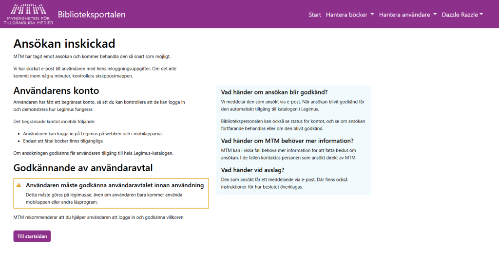 När ansökan skickats iväg får du denna bekräftelse. Nu kan den sökande via den länk som skickas till den angivna e-postadressen logga in på sitt Legimus-konto och godkänna användaravtalet.