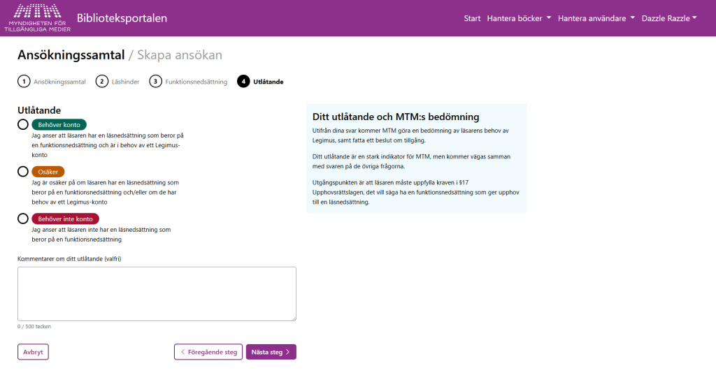 I detta steg avslutar du ansökningssamtalet och anger ditt utlåtande om du anser att den sökande uppfyller kraven för att få tillgång till Legimus. I och med detta steg är själva informationsinsamlingen genomförd. Nu är det dags att gå vidare till att skicka in själva ansökan.